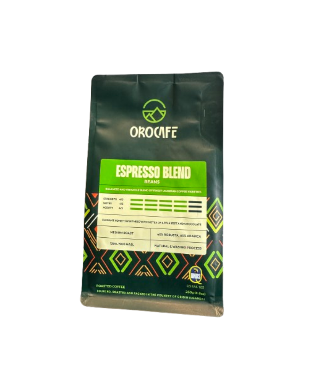 Savor thee perfect balance of mild Arabica and strond-tastiing Robusta from Uganda's Highest peacks with Orocafe's Espresso Blend, carefully crafted coffee experts.